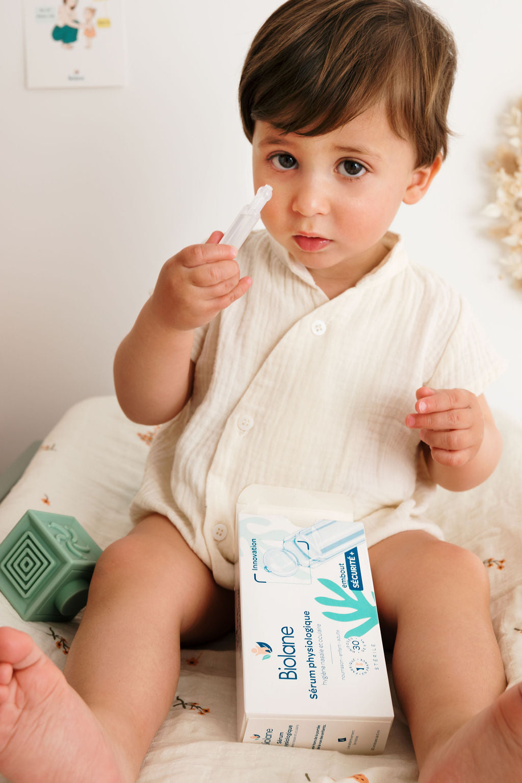 Pour ce soin justement, on vous recommande l’une de nos dosettes de sérum physiologique à usage unique et à embout rond. Un embout bien plus adapté à la forme de la narine. Résultat, vous pourrez l’insérer sans risquer de blesser votre bébé si jamais il gigote pendant le soin.