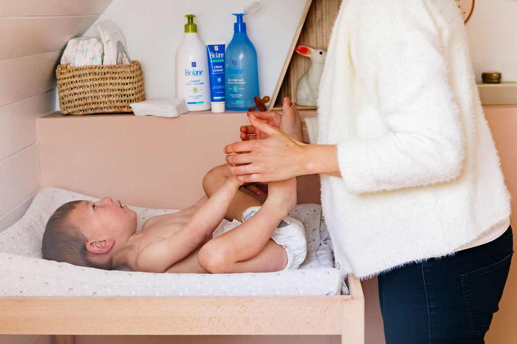 - Dernière chose : si les selles ont débordé dans le dos de votre bébé, ne soulevez pas ses fesses en tirant ses jambes vers le haut. Basculez doucement votre bébé sur le côté (l’oreille contre la table à langer). Vous pourrez nettoyer son dos facilement sans tirer sur ses hanches et vous évitez aussi les régurgitations.