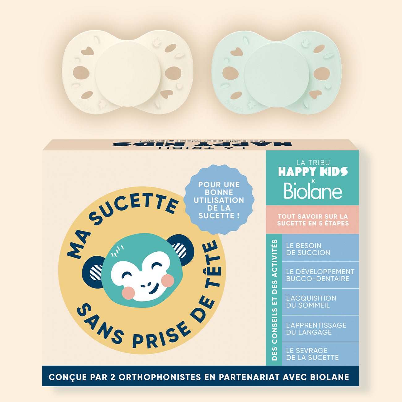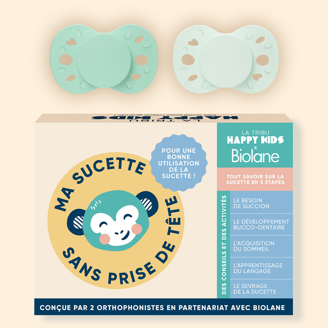 Conçu en partenariat avec le collectif de professionnels de santé de La Tribu Happy Kids, le coffret "Ma sucette sans prise de tête" a pour objectif de sensibiliser les parents à une utilisation responsable de la sucette. Un lot de 2 sucettes anatomiques accompagne la boîte.