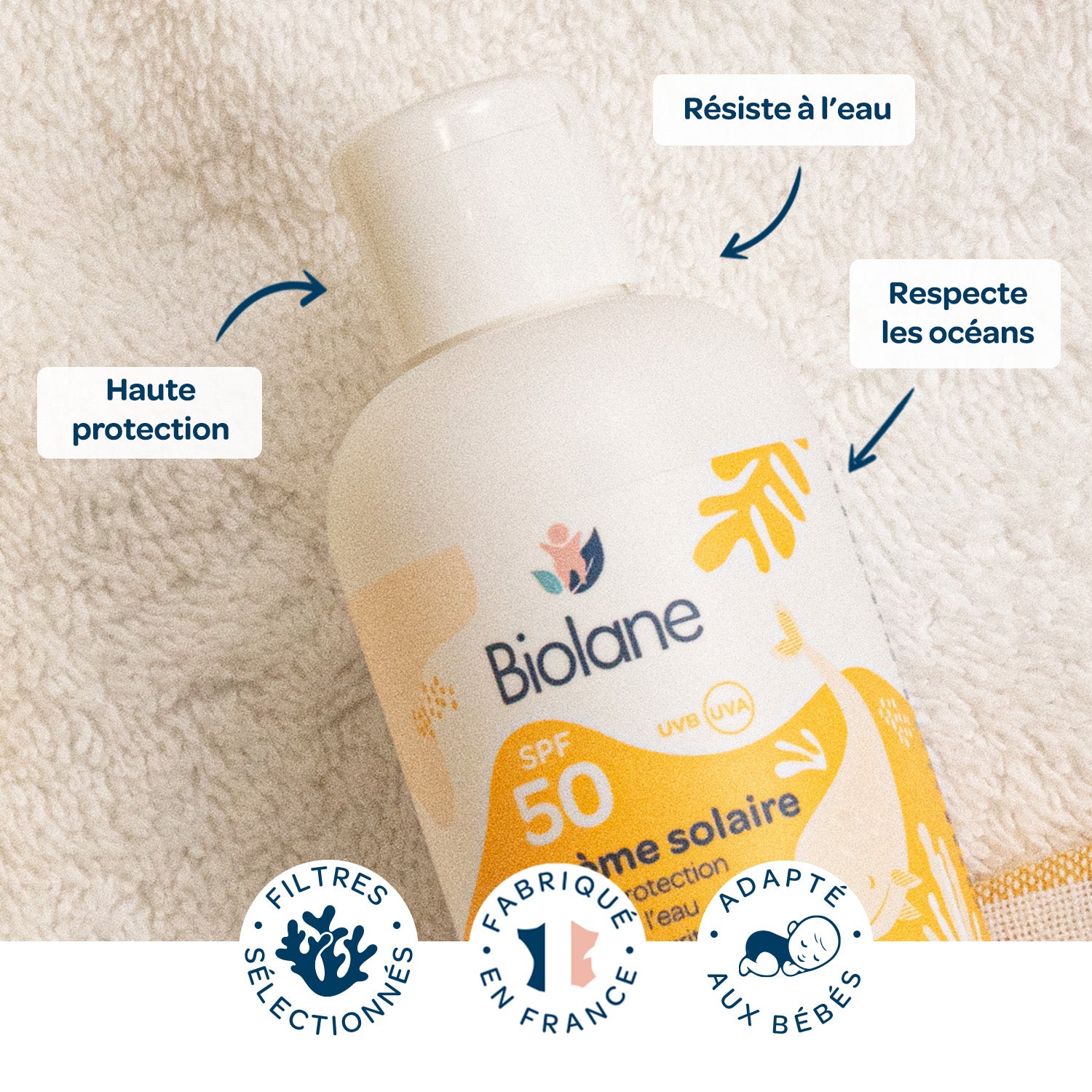 L’été en toute sécurité avec votre bébé grâce à la crème solaire SPF50 Biolane qui garantit une haute protection solaire spécialement conçue pour la peau délicate de votre bébé, et respectueuse des océans.