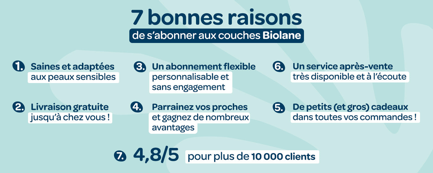 Nos couches sont aussi disponibles sous forme d’abonnement sans engagement, avec livraison à domicile. Pour les découvrir, recevez directement chez vous notre kit d’essai gratuit (6 couches) et faites l’expérience des couches Biolane !