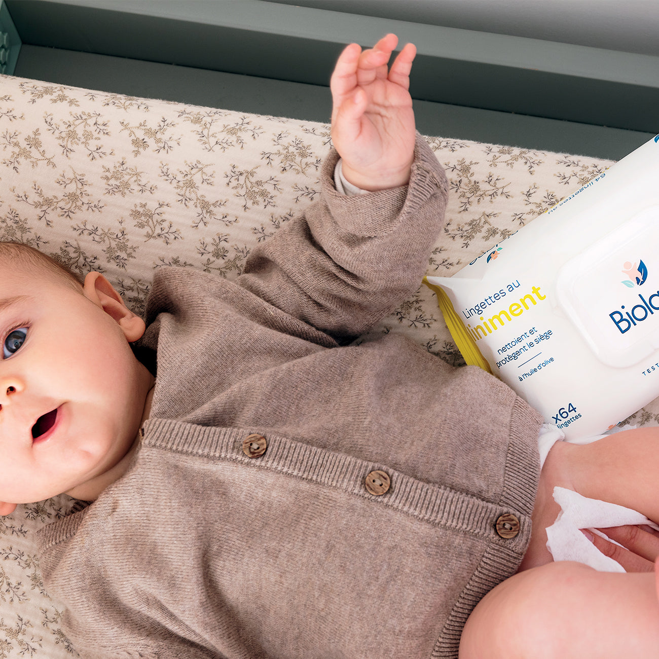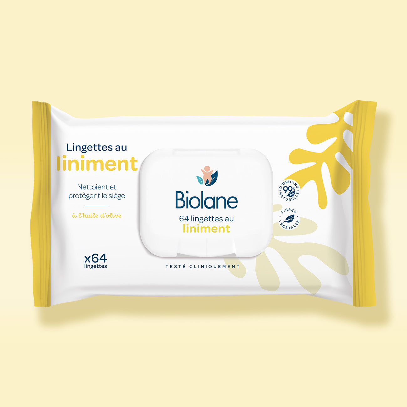 Les lingettes au liniment Biolane nourrissent et apaisent l'épiderme fessier, tout en laissant un film protecteur contre les agressions extérieures (urines, selles, frottement des couches).