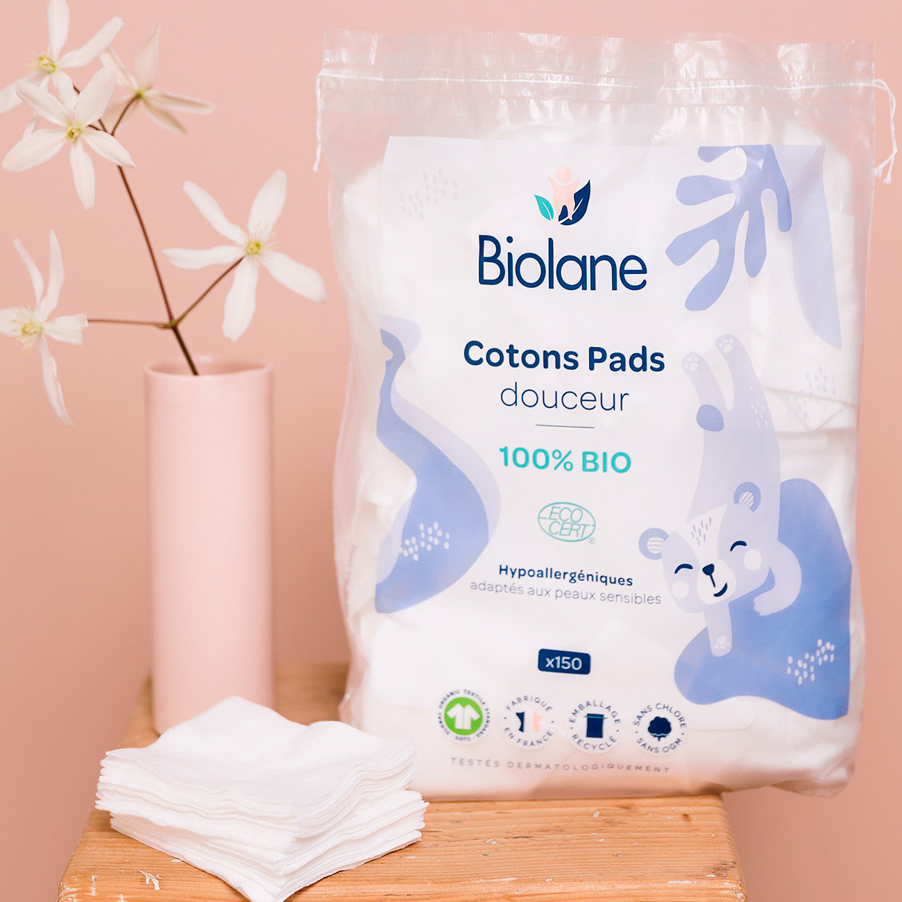 Lot de 3 paquets de 150 cotons pads douceur : Le coton est un indispensable pour le change et la toilette du bébé. Pour protéger la peau de votre bébé, les cotons pads 100% BIO Biolane sont adaptés aux peaux les plus sensibles.