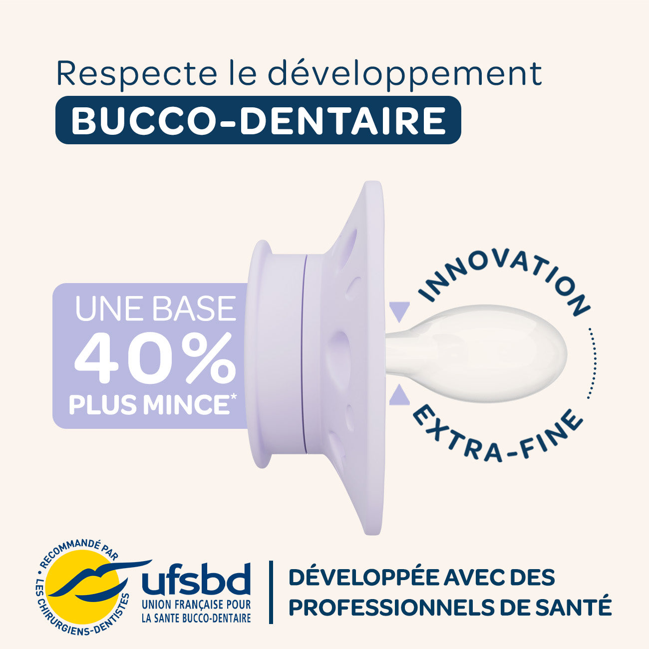 Nos sucettes en silicone extra-fines sont dotées d'une base 40% plus fine* que la moyenne des sucettes présentes sur le marché.