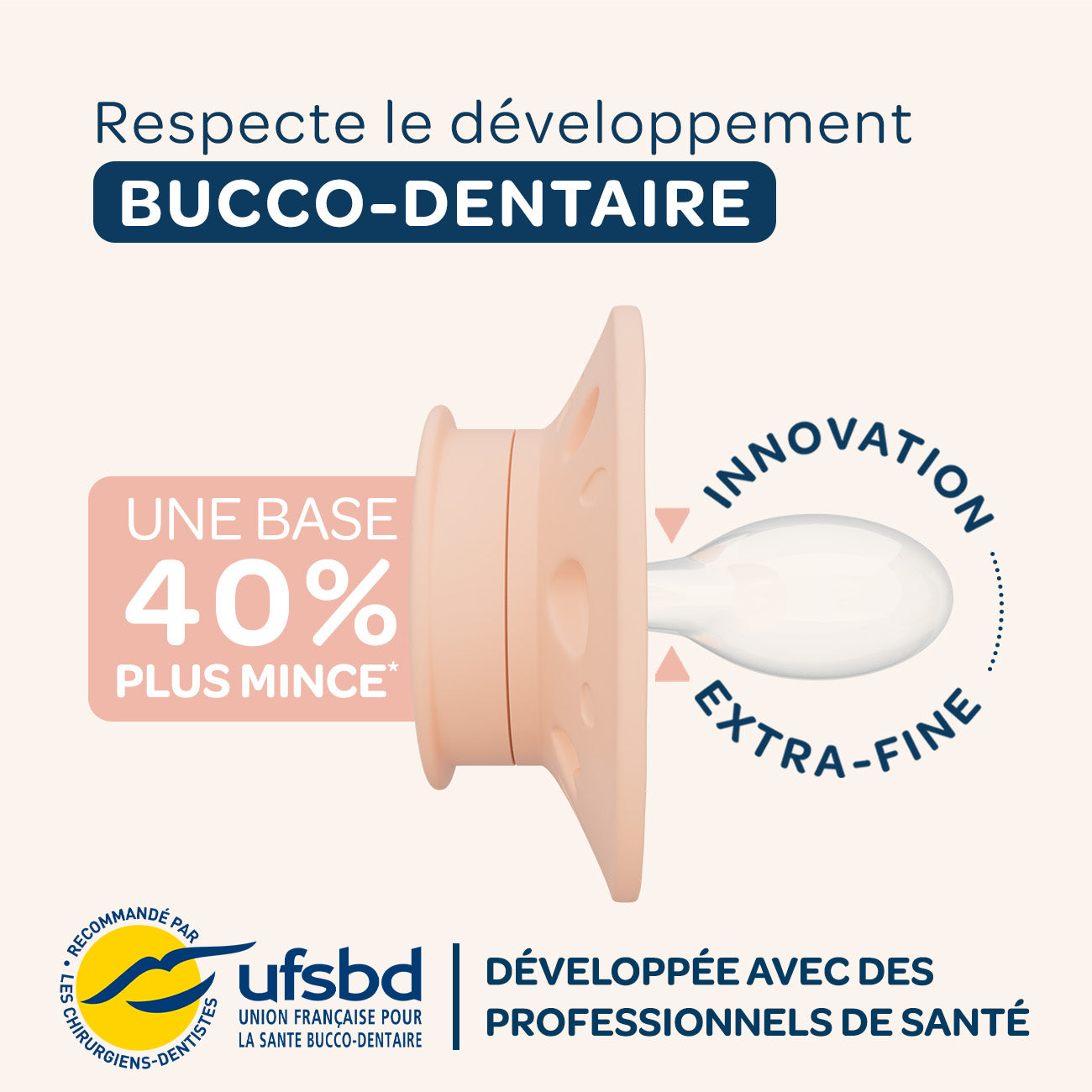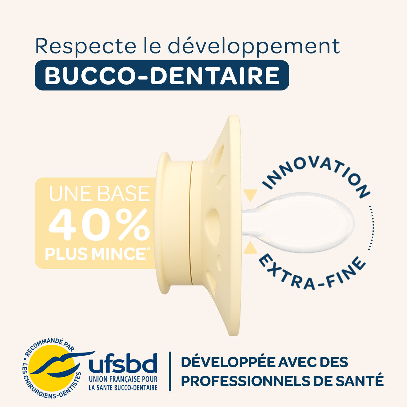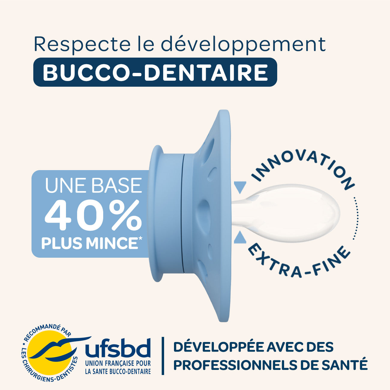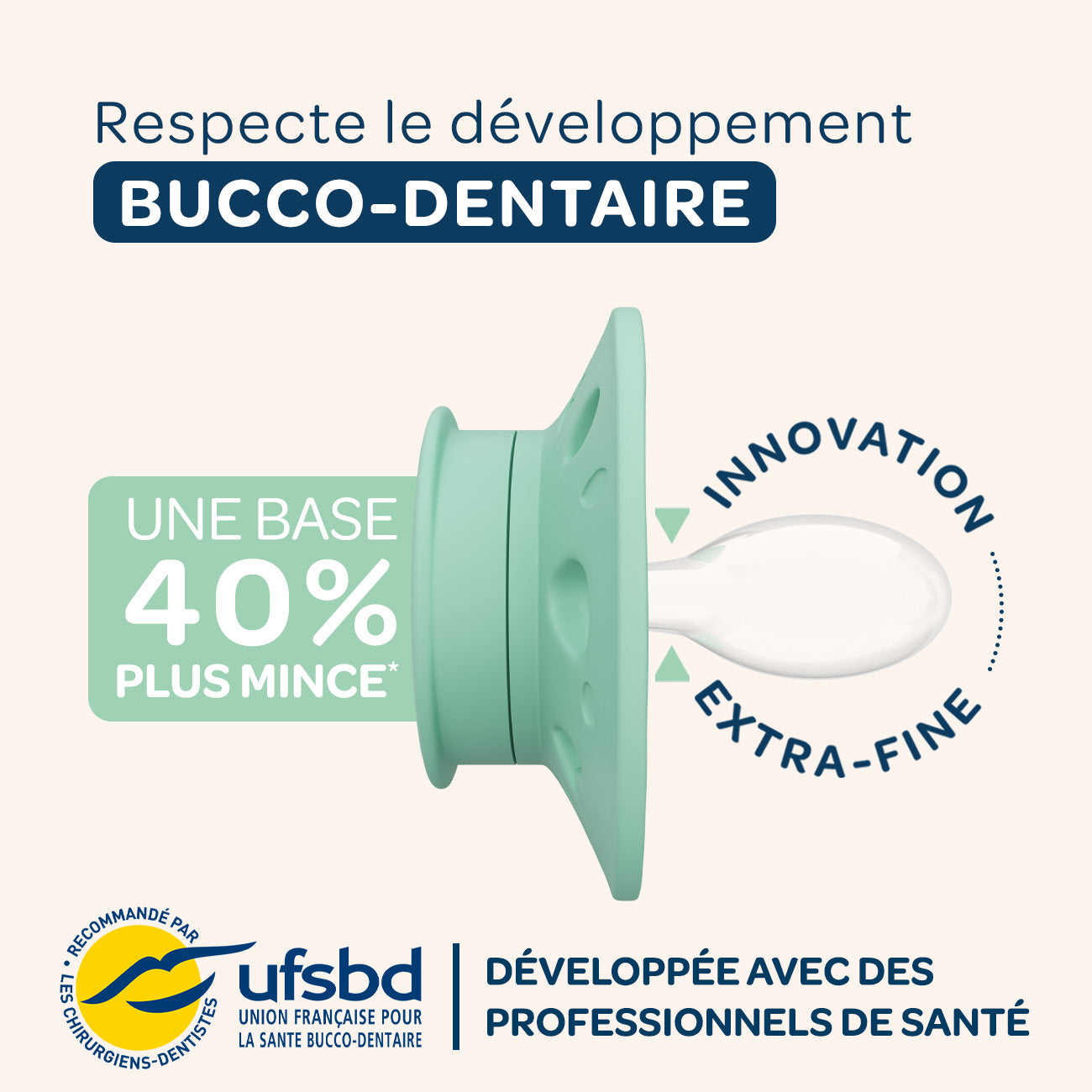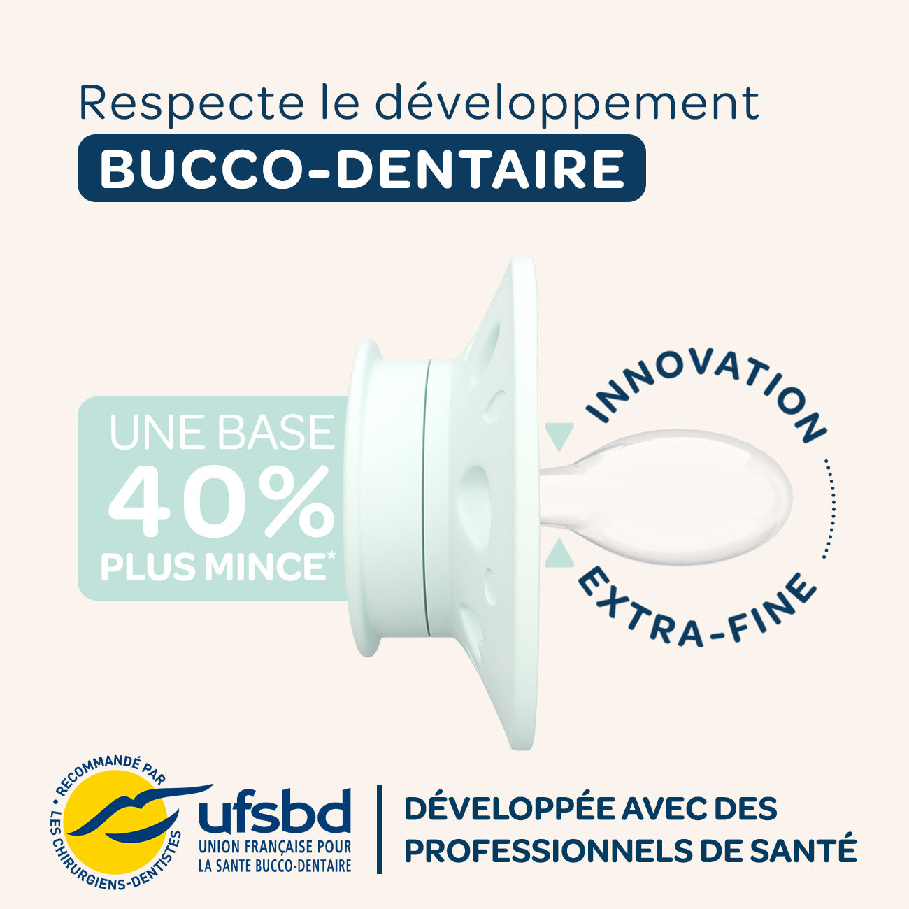 Nos sucettes en silicone extra-fines sont dotées d'une base 40% plus fine* que la moyenne des sucettes présentes sur le marché.