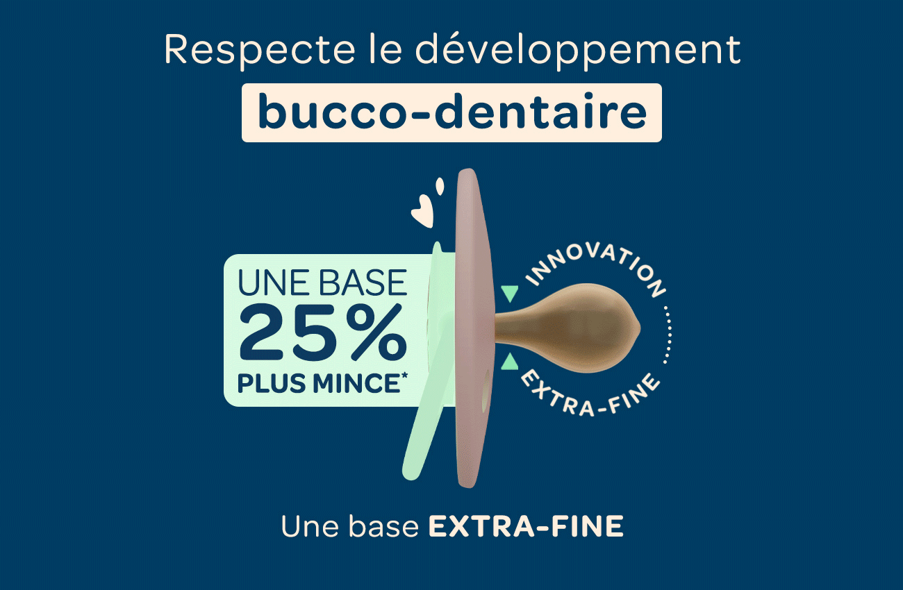 Non, la base extra-fine de nos sucettes assure une bonne fermeture labiale et évite les béances, qui pourraient impacter le développement bucco-dentaire. La sucette n’a pas d’impact sur la dentition si vous l’utilisez de manière responsable. Au contraire, la sucette stimule la langue et le palais, qui jouent un rôle dans l'harmonie du visage et les fonctions associées, comme la respiration, la déglutition et l’articulation.