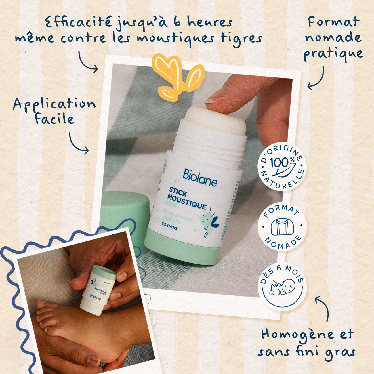 Protégez la peau sensible de votre bébé des piqûres de moustiques grâce à notre stick moustique, formulé pour fondre sur la peau avec un fini invisible et non gras.